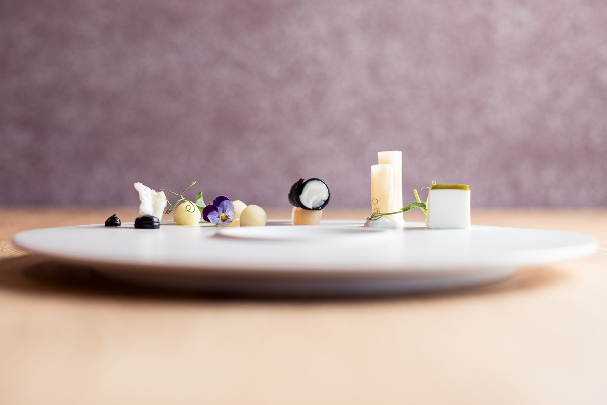 In der Küche entwickelt Marc Oberhofer daraus vielschichtige Aromen. Himbeeren fermentieren, Sprossen gewinnen mit der Zeit an Tiefe. Brokkoli reift zunächst in Salzmarinade, bevor Essig neue Nuancen freilegt. Molke wird gebrannt und erhält eine überraschende Intensität. Diese Arbeit verlangt Geduld und Präzision. Geschmack entsteht durch Reife und bewusste Reduktion. Nichts geschieht zufällig. Jede Zutat hat ihre Herkunft, jeder Schritt folgt einer klaren Entscheidung. So verarbeitet das Team auch das Fleisch von Südtiroler Produzenten konsequent nose to tail, nutzt Gemüse vollständig und arbeitet mit dem, was die Region hergibt. Selbst Bienenwachswaben kommen als feine Aromaträger zum Einsatz. Sie binden Honignoten ein und veredeln Texturen. Naturmaterialien ergänzen die Gerichte zudem als dezente und bewusst gesetzte gestalterische Elemente.