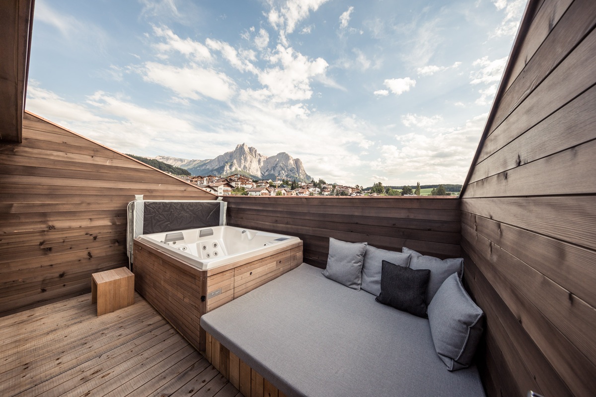 Die Verlegung des Hoteleingangs an die Dolomitenstraße entlastete den Dorfplatz und ermöglichte die Öffnung von Gasthaus, Bar und Terrasse zum Ort hin. Im Inneren führen klare Wege durch großzügige Räume. Die Lobby wirkt offen und übersichtlich, helle Zimmer und regionale Materialien prägen eine ruhige, zurückhaltende Atmosphäre. Ein architektonisches Statement setzt der puristisch gestaltete Sky-Pool im Giebelgeschoss. Unter einem Glasdach, das im Sommer geöffnet werden kann, schwimmen Gäste mit Blick auf den Kastelruther Kirchturm und den Schlern. Viel Tageslicht und die ins Dach verlegte Saunalandschaft formen hier einen Wellnessbereich mit Weite und Transparenz. Bei Planung und Umsetzung arbeiteten Bauherren und Architekten eng mit regionalen Handwerksbetrieben zusammen. Sie setzten bewusst auf langlebige Materialien.